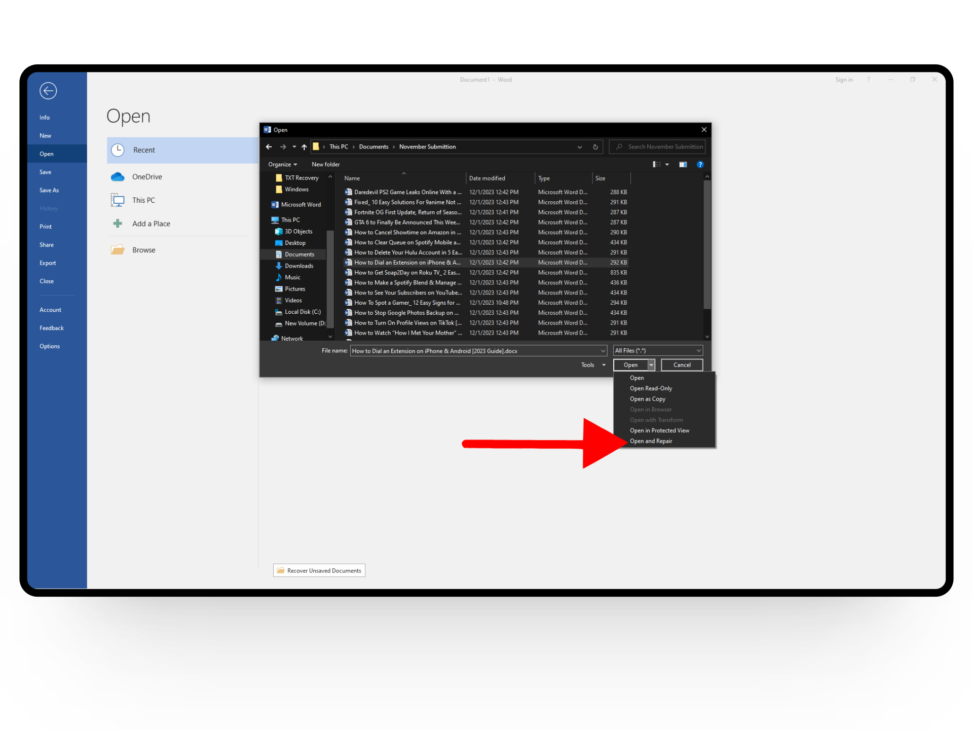 Open and Repair is another built-in tool in MS Word that acts similar to Text Recovery converter but it’s designed to fix minor issues with Word documents.
