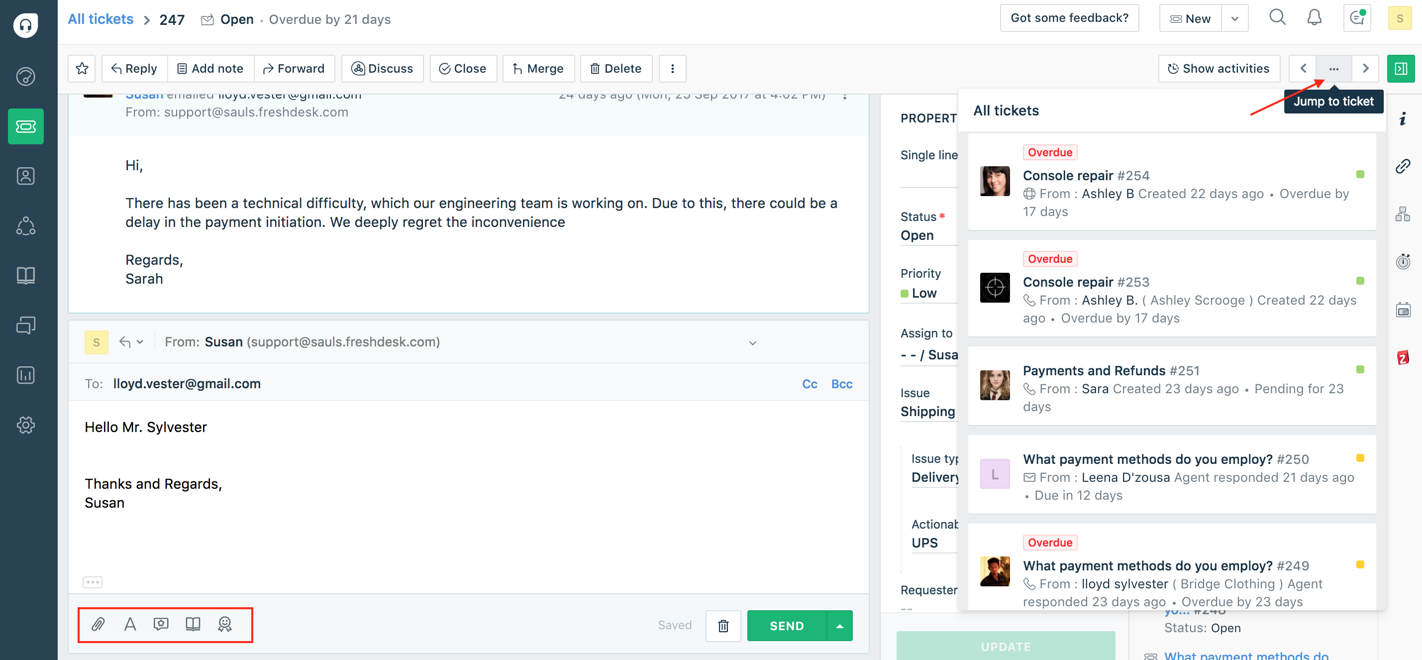 Also, just like the SolarWinds Web Help Desk, Freshdesk allows you to create custom replies that will be sent in response to common questions. It also has a way of establishing relationships between different tickets and consequently allowing you to provide a singular response to all of them.