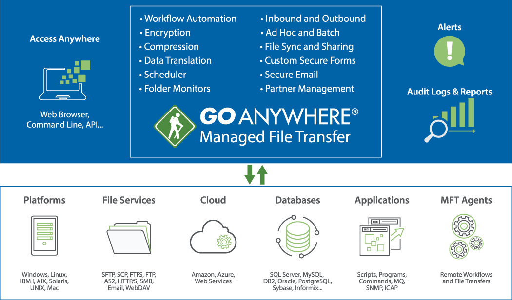 GoAnywhere is a very popular tool that facilitates easy and secure transfer of data between systems, employees, customers and trading partners. The tool can be run both on-premise or on the cloud on platforms such as Microsoft Azure. It is compatible with all the popular Operating Systems including Windows, Linux, AIX, and IBM.
