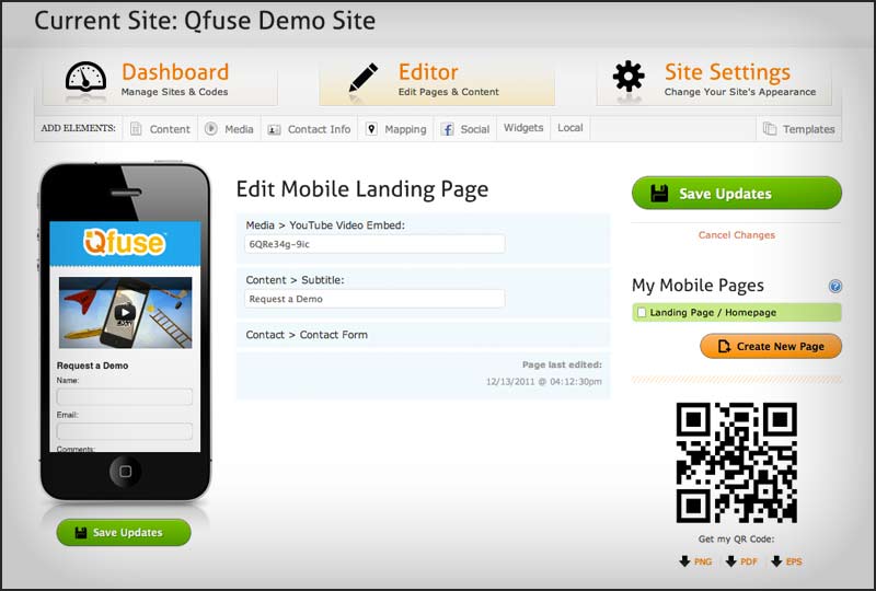 Qfuse also includes a simplified mobile website and landing page builder that does not require any knowledge in coding to execute. Since the QR codes are dynamic, the process of changing them after they have been printed is effortless.
