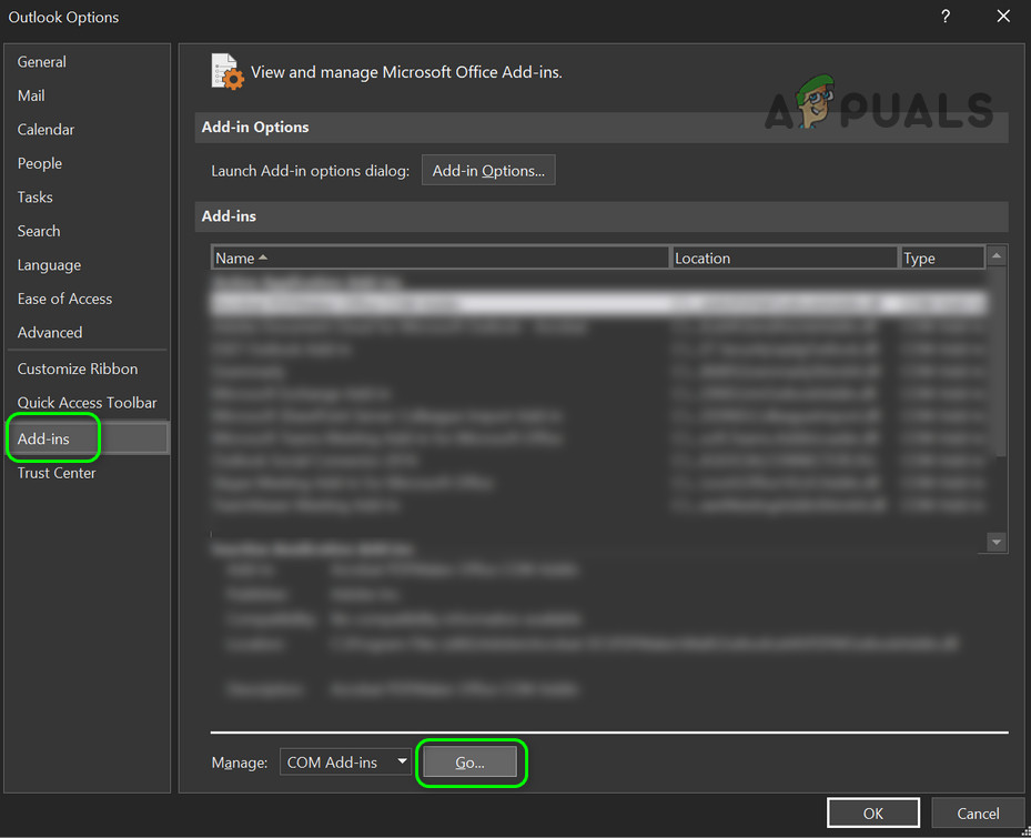- Then click on Go (make sure COM Add-ins are selected in the Manage dropdown).