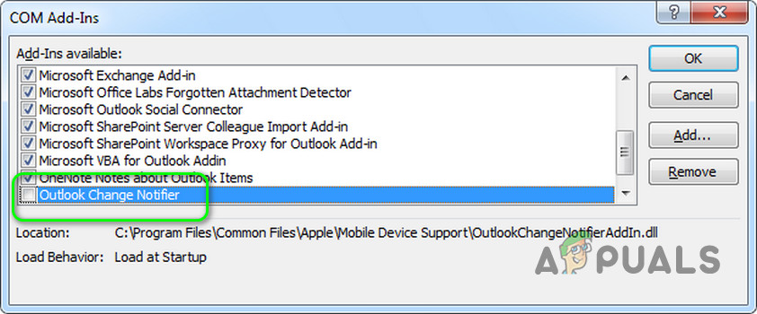 Manage COM Add-Ins in Outlook - Now uncheck the iCloud add-in & check if the mail client issue is resolved.