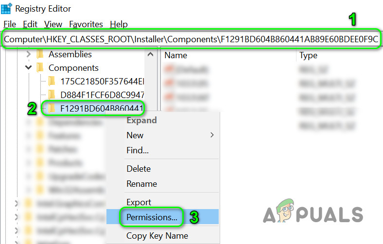 - Then right-click on the F1291BD604B860441AB89E60BDEE0F9C key (in the right pane) & select Permissions.