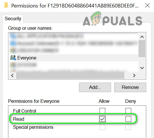 Add Everyone to the Permissions - Now click on OK & then click on the Read checkbox.