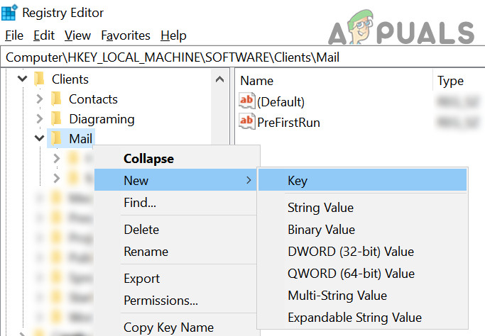 - Now right-click on the Mail (in the left pane) & select New>>Key.