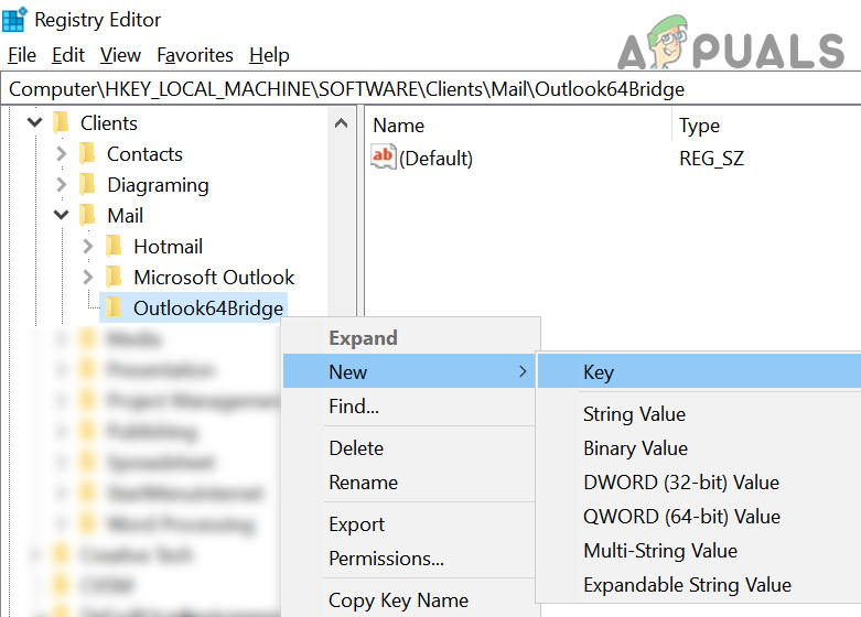 Create New Mail Key - Then name the key as Outlook64Bridge & then, again in the left pane, right-click on the Outlook64Bridge.