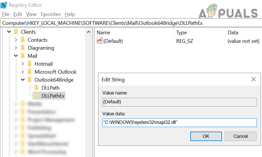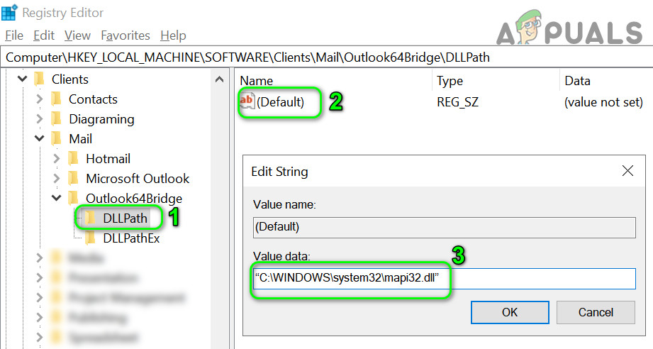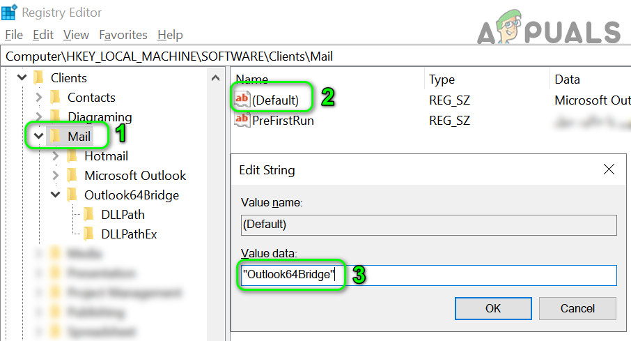 Set the Mail Default Key to Outlook64Bridge - Now click on OK & reboot your PC after exiting the Registry Editor.