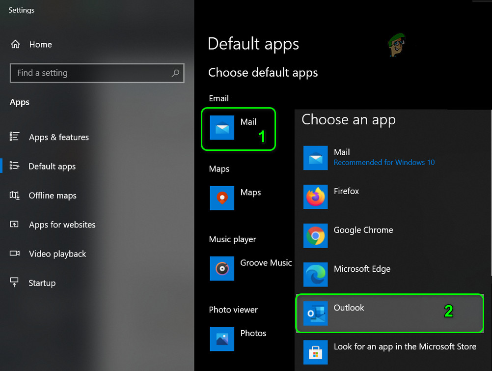 Open Default Apps - Now check if the default Email application is set to Outlook. If not, then click on the Application & select Outlook as the default, & reboot your PC to check if the issue is resolved.