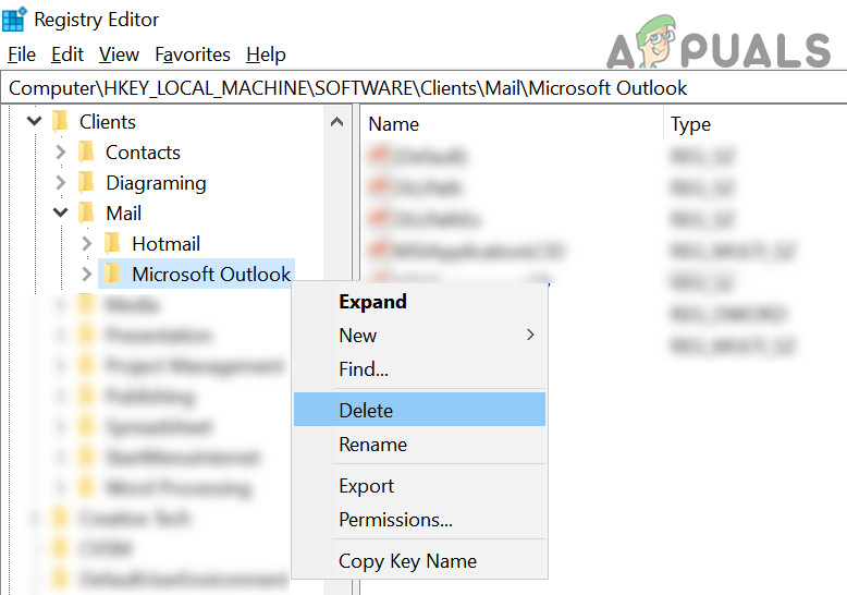 - Now, right-click on the Microsoft Outlook key (in the left pane) & select Delete.