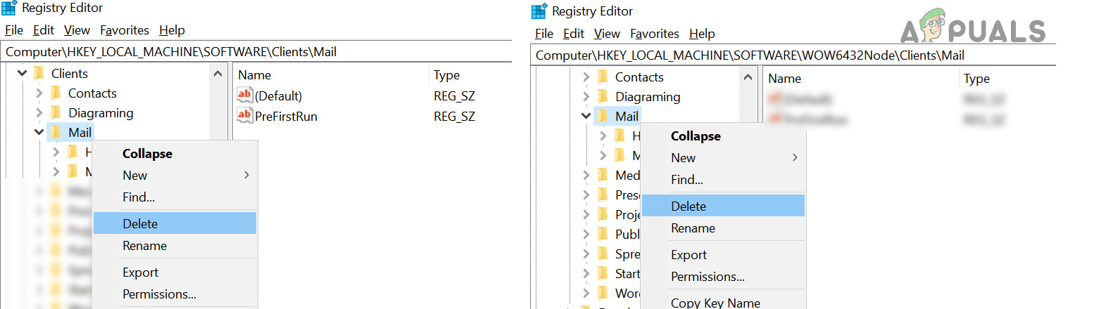 - If not, then check if deleting the Mail key (in the left pane) of the keys mentioned in step 1 & repair the office installation (solution 2).