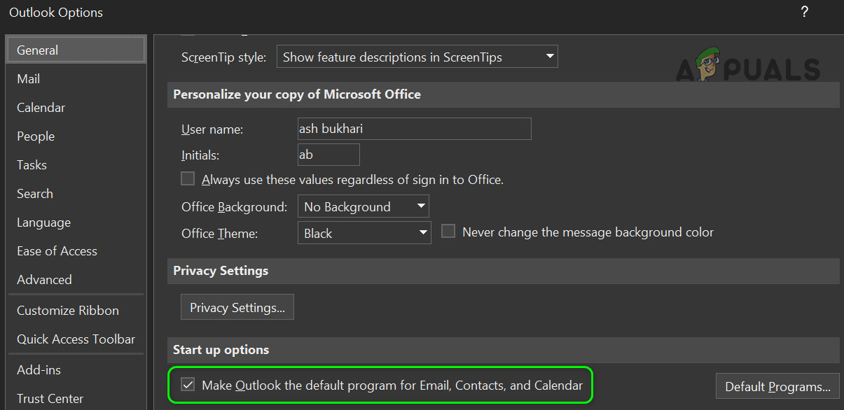 Set Outlook as The Default Email Client - If not, then launch Outlook & open its Options.