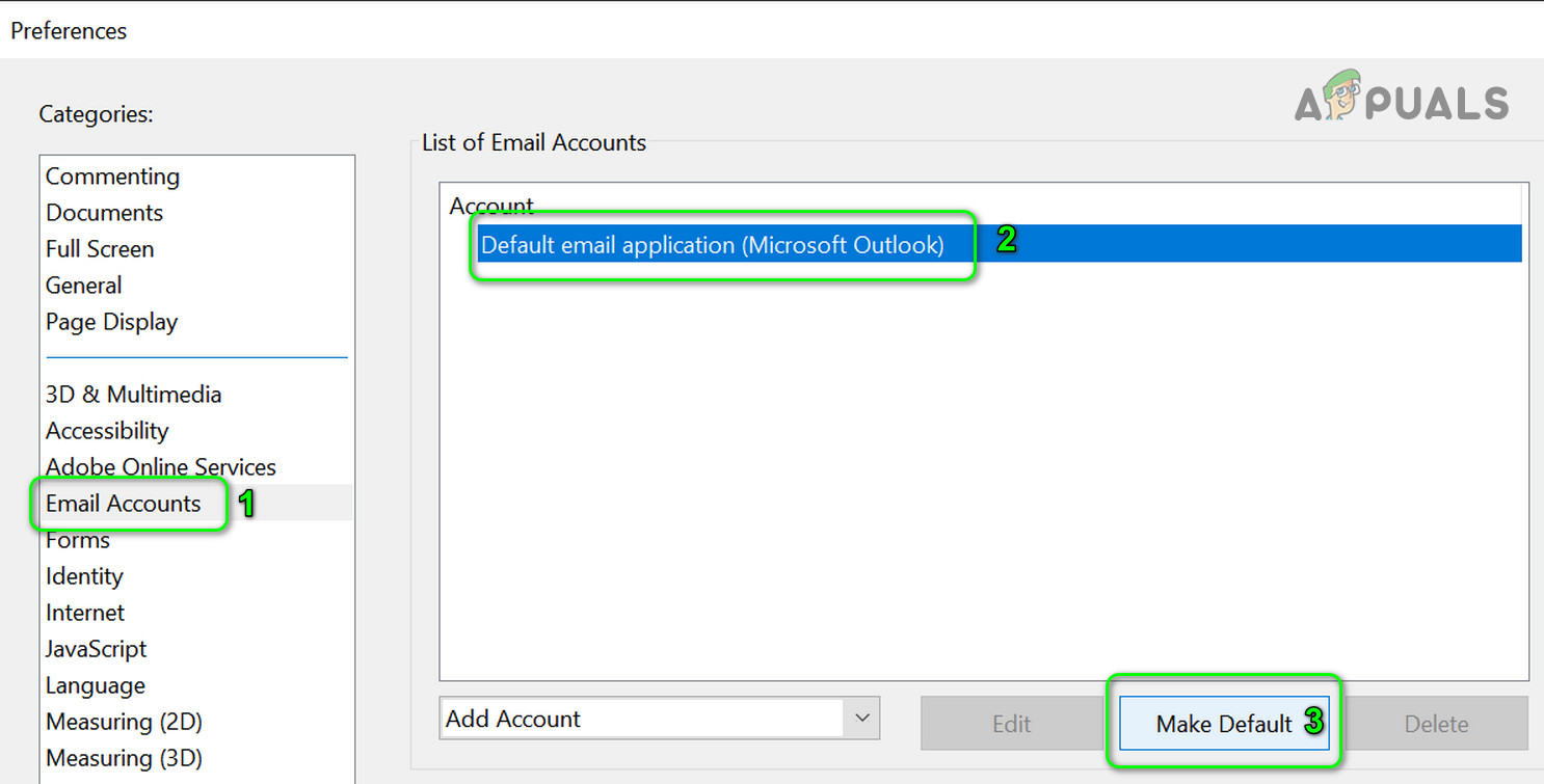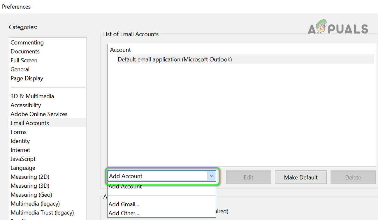 Open Preferences of Adobe Reader - Then, in the right pane, select Outlook/Outlook account & click on Make Default.