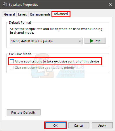 - Uncheck the option that says Allow applications to take exclusive control of this device.