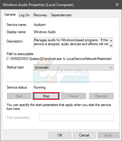 - Click Stop in the Service Status section