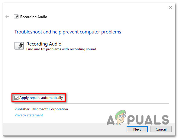 Opening the correct Troubleshooter - After you manage to open the correct troubleshooter, click on the Advanced hyperlink, then check the box associated with Apply repairs automatically. After you do this, click on Next to begin the initial scan.