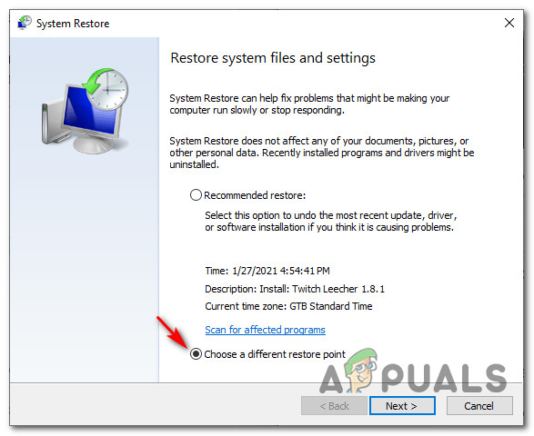 Opening the System Restore utility - Once you’re inside the first screen of System Restore, start by selecting the Choose a different restore point before clicking Next.
