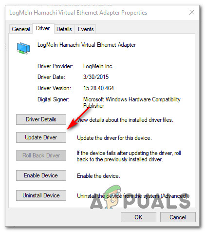 Accessing the Properties screen of the affected device - Once you’re inside the Properties screen, access the Driver tab from the menu at the top, then click on the Update Driver button.