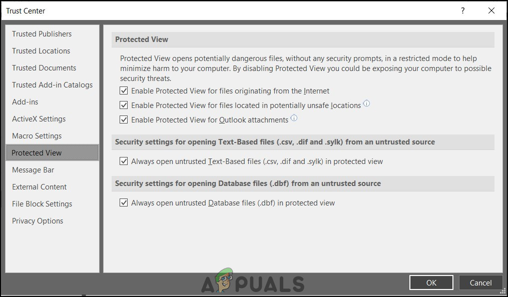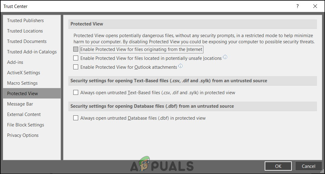 This solution was provided in the case of a Windows update or Office 365 update causing changes in the Trust Center Settings. Microsoft is known for pushing updates that change the settings of certain apps as a direct effect or indirectly. Therefore, you will have to manually reset your Trust Center Settings to default. By default, Protected View is enabled. To reset your settings