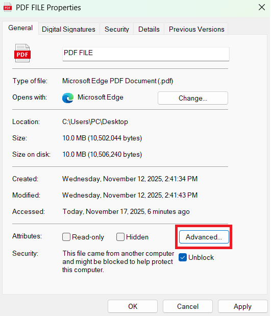 If the Unblock option does not appear, the file may not contain a Mark of the Web tag, or restrictions may be applied through security policy or antivirus software.