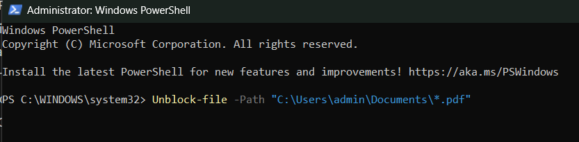 Unblock-File -Path "C:\Users\YourUsername\Documents\*.pdf"