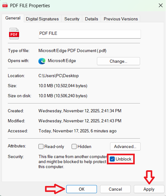 Removing the security block deletes the Mark of the Web tag and allows File Explorer to preview the file. Only do this for files you trust.