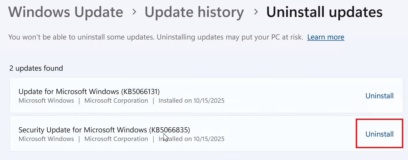 Important: Security updates improve system protection. Removing them may expose your system to vulnerabilities, and Windows Update may reinstall them automatically.