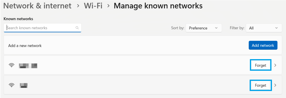 - Find your Wi-Fi network and click Forget to remove the saved connection.