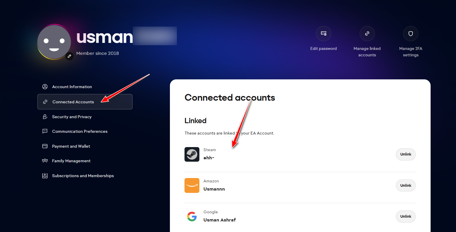 - Find Connections / Connected Accounts and confirm Steam is linked to this EA account.