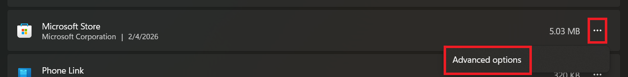 - Click the three dots next to Microsoft Store and choose Advanced options.