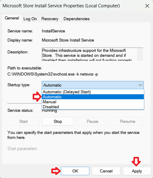 Setting it to Automatic ensures it is available whenever Microsoft Store needs it. This service is not present on all Windows builds or editions. If you do not see it, skip this method and continue to the next one.