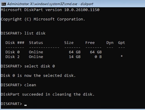 Tip: After select disk X, use detail disk to confirm the drive (model/size) is the one you intend to wipe. If it’s not, run list disk again and select the correct disk.