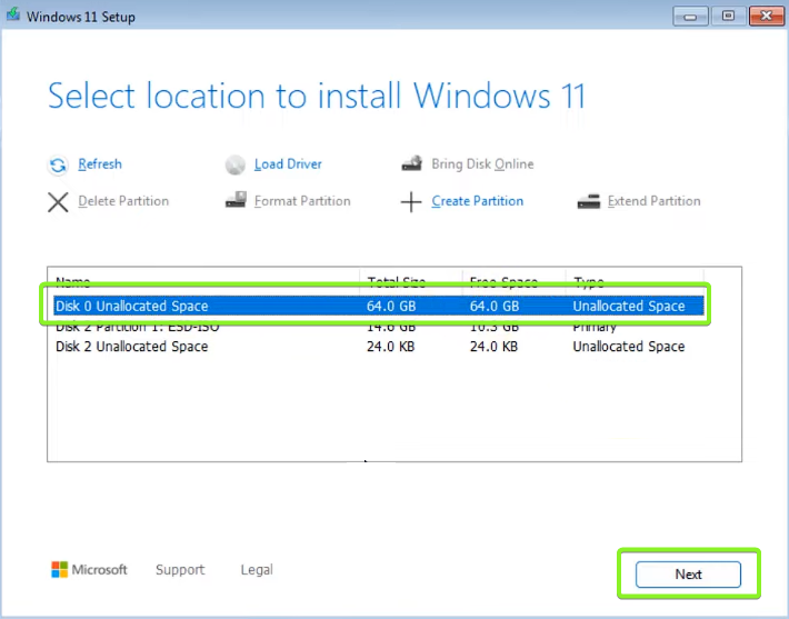 Expected result: The disk appears as a single unallocated entry, Setup creates partitions automatically, and installation proceeds.