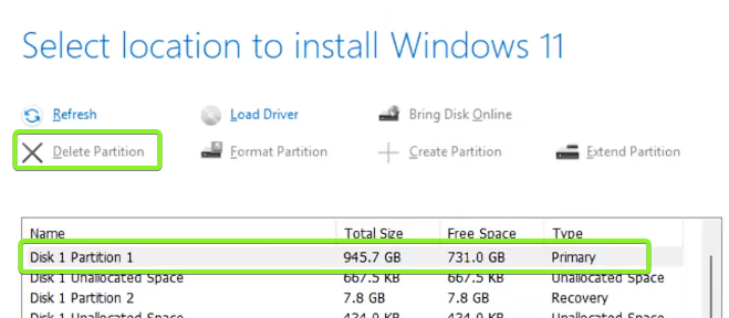 Windows Setup can fail to select a target when existing system partitions (EFI/System/Recovery) or leftover partitions conflict with the new install. Deleting the partitions turns the drive into Unallocated space, allowing Setup to recreate the required partitions automatically.