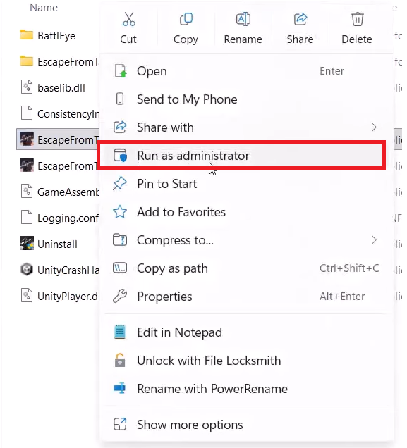 - Right click EscapeFromTarkov.exe and select Run as administrator.