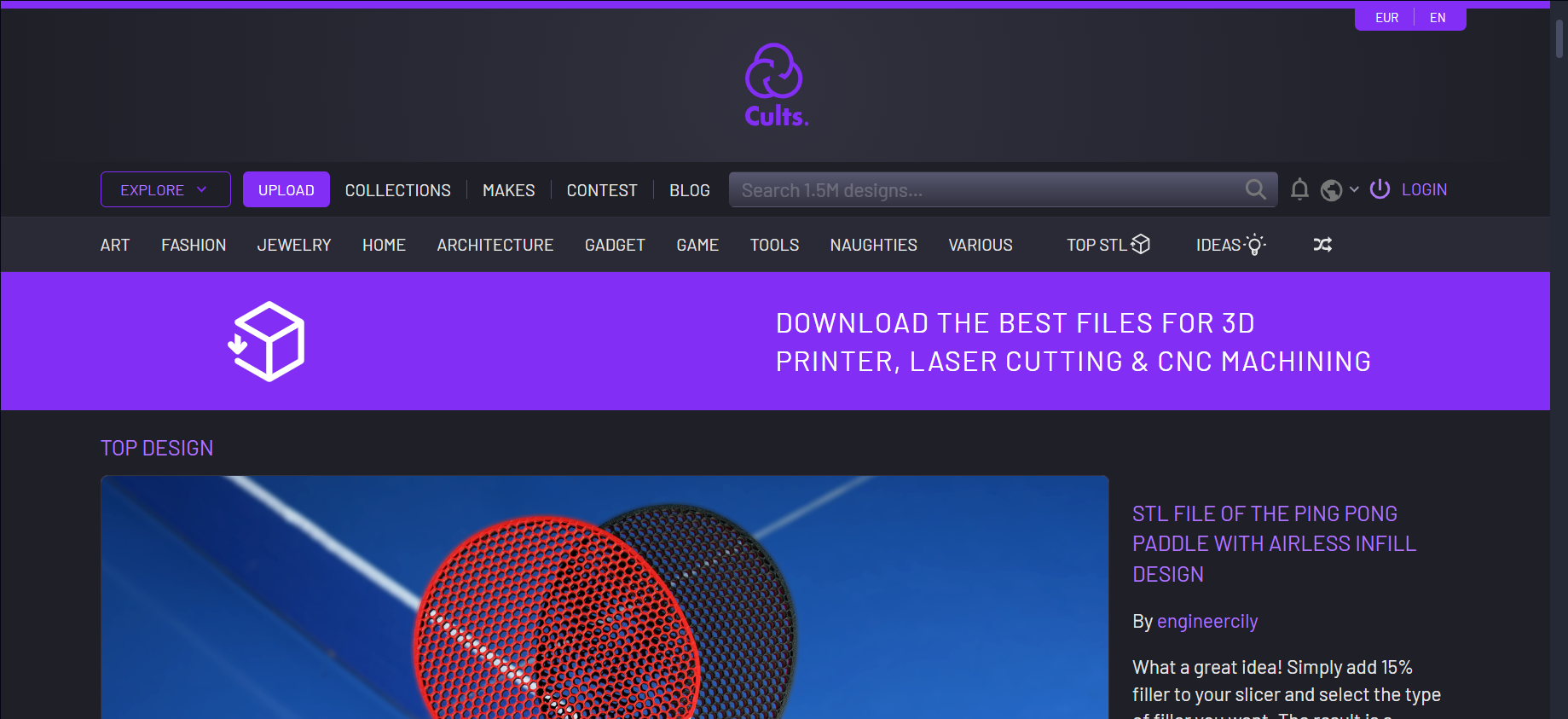 Cults is also known for regular design competitions, monthly featured STL showcases, and seamless import tools that bring models from Thingiverse into its own library for broader exposure.