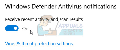 (Gear icon) - Under Windows Defender Antivirus notifications, look for Virus & threat protection settings and click on it