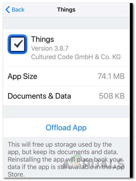 As it turns out, the first workaround to the said error message is to offload the application. You probably have noticed while going through an app in your device settings that there are actually two options. Offloading is different than deleting an app. The difference being when you offload an application, it gets rid of the application while keeping your data and documents. Thus, when you install the application, you still have your files and they are not lost. Follow the instructions below to offload the culprit application: