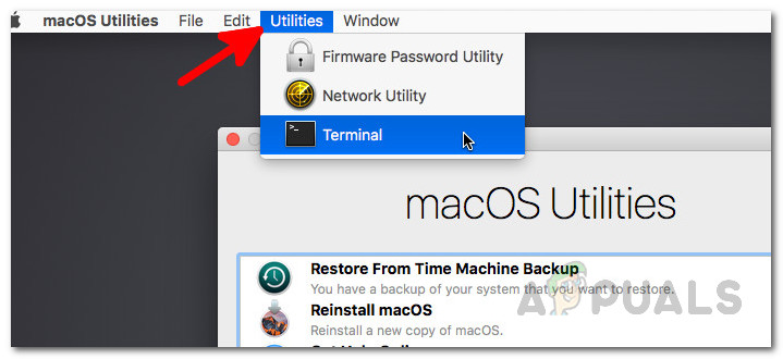Booting into MacOS Recovery - After that, on the macOS Recovery screen, click on the Utilities option at the top and launch a Terminal.