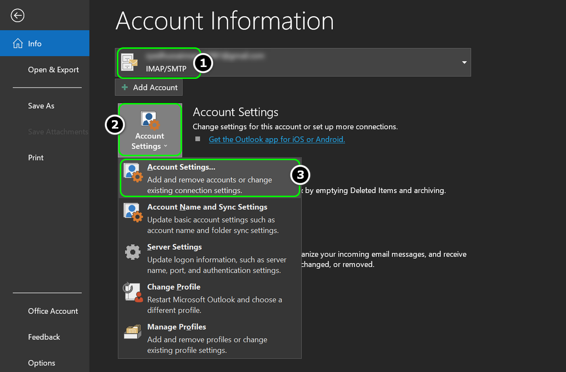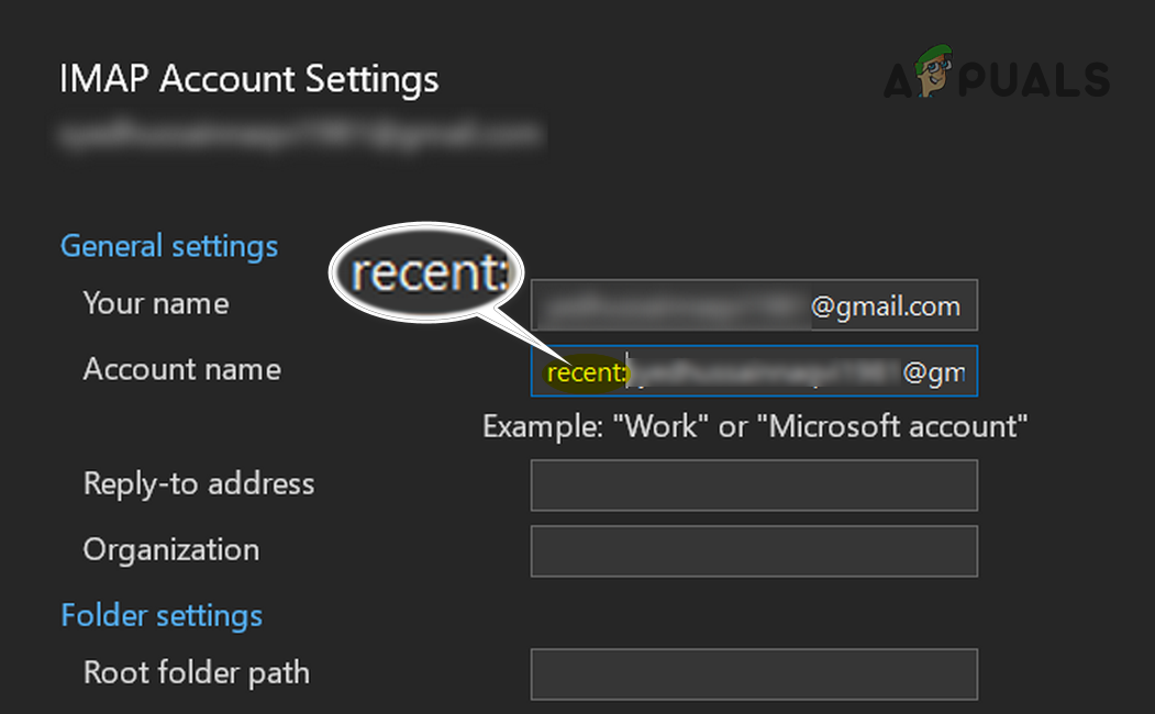 Open Account Settings in Outlook - In the Account Name box, add “recent:” before your account name, e.g., if your account name is testuser@gmail.com, change it to recent:testuser@gmail.com.