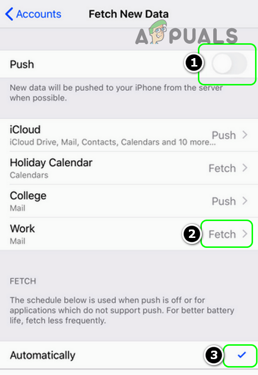 To make sure your emails load consistently, set your phone to “Fetch,” so it checks for new messages regularly. This keeps your inbox updated and reduces delays from server sync issues, helping fix the “Message has not been downloaded from the server” error.