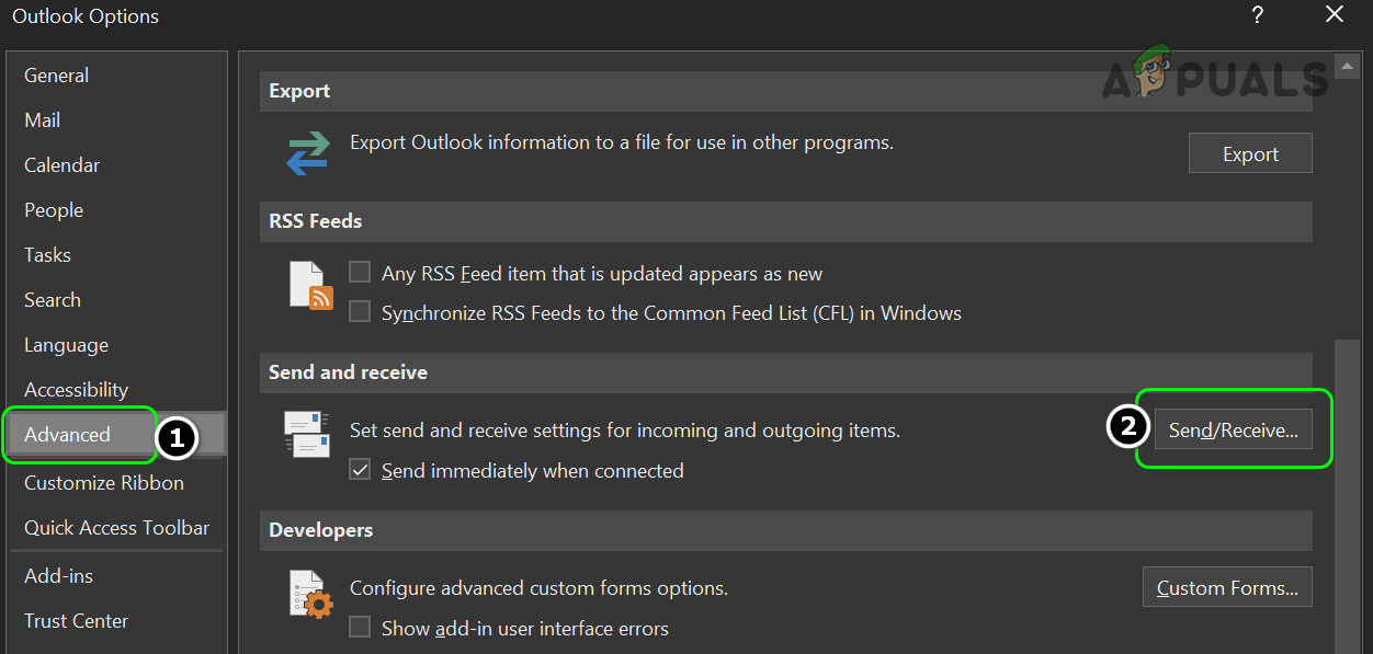 Open Outlook Options - In the Send/Receive section, click Send/Receive and select All Accounts or select the problematic account if listed.