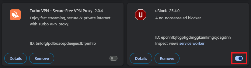 - Locate uBlock Origin, Tampermonkey, or any other ad-blocker.