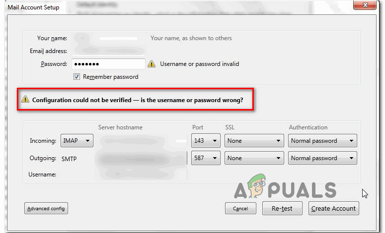 Some Windows and Mac users are encountering the “Configuration could not be verified” error when trying to connect their email account with Thunderbird. This error appears immediately after they insert their email credentials and they click on Done or Create Account.