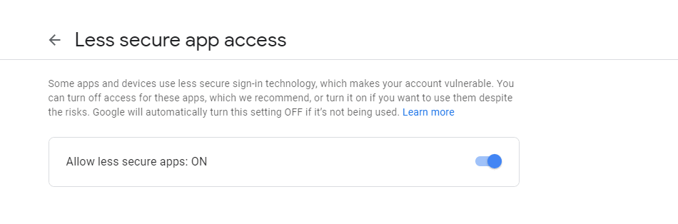 Turn on access - Inside the Less secure app access menu, simply enable the toggle associated with Allow less secure apps: OFF.