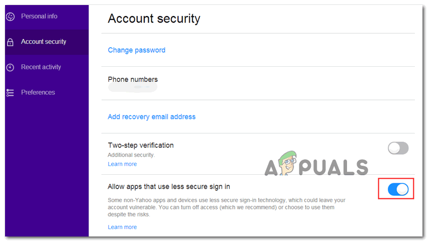 - Less secure apps are not allowed – In case you are encountering this problem with a Yahoo or Google email, keep in mind that communications might be blocked due to the fact that your email provider is blocking less secure apps. In this case, you will be able to fix the issue by accessing the settings menu of Gmail or Yahoo and allow less secure apps to sync data.