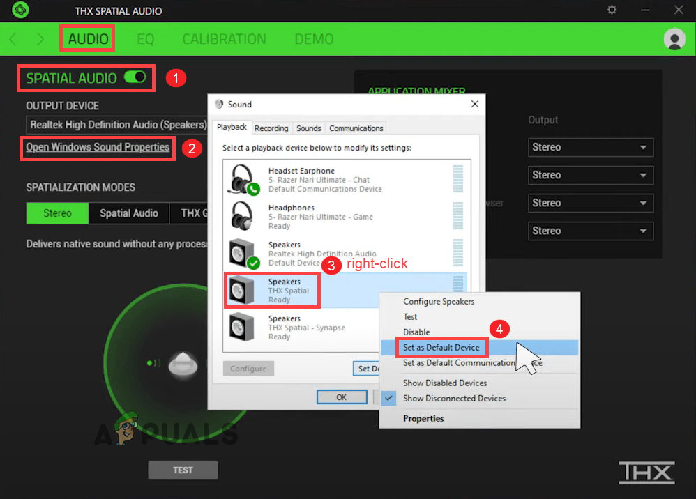 If the THX Spatial Audio app has been set as the main playback device, then this may not function properly in the dedicated manner and this could be the reason that you are encountering this issue. So, try dealing with the situation by setting the Spatial audio app as the main playback device. Many gamers reported that setting the app as the main playback device resolves the problem in their case.