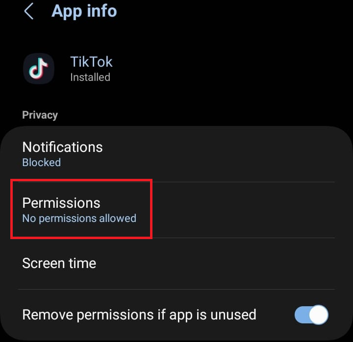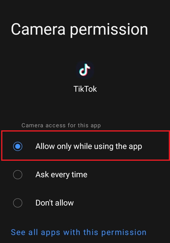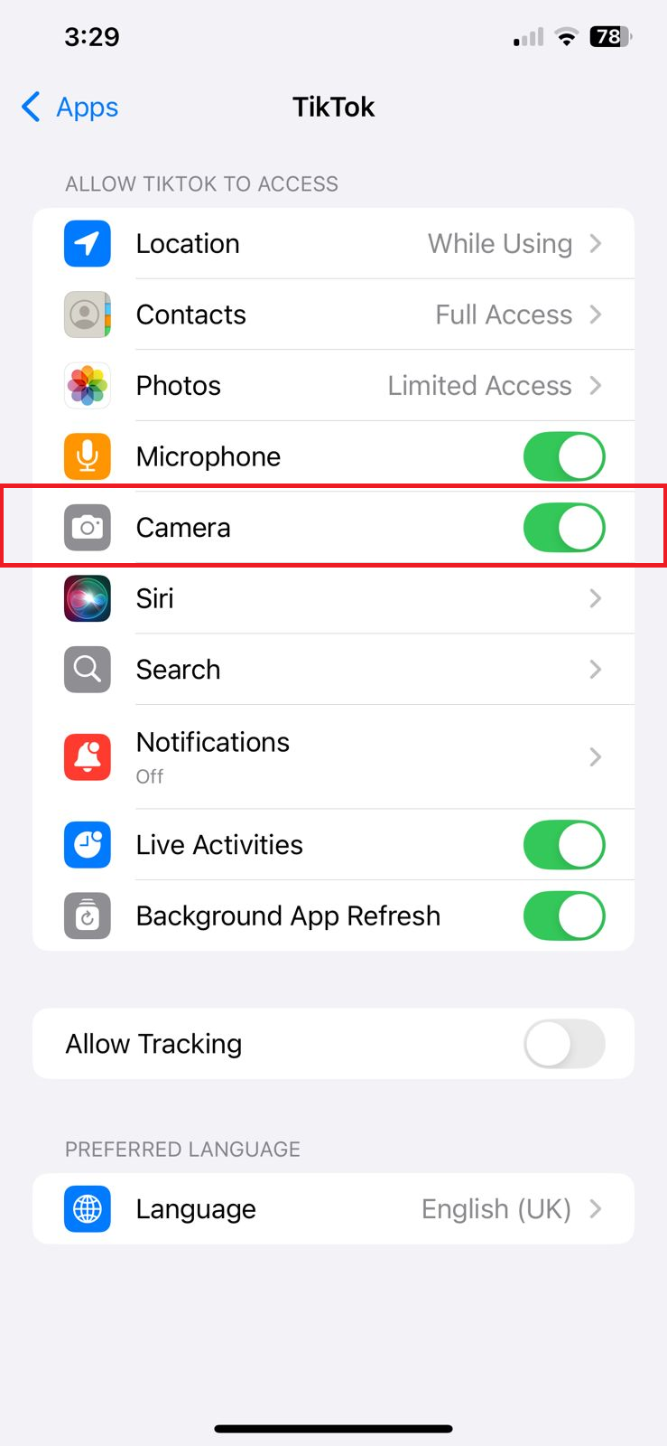- Under Allow TikTok to Access, enable the “Camera” option.