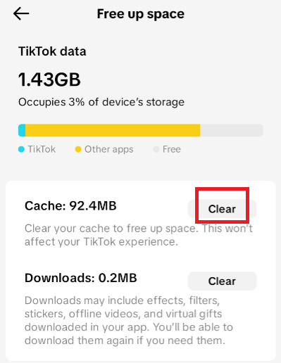TikTok stores temporary data such as thumbnails, previews, login details, and personalized settings. Over time, these cached files can become corrupted or outdated, causing the app to malfunction and preventing the camera from loading correctly.