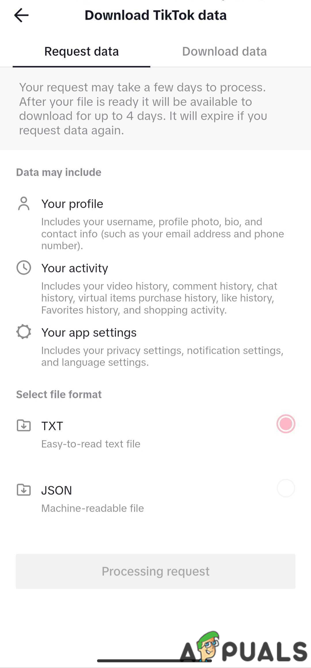- Select your preferred file format, either TXT or JSON, and tap Request data.
