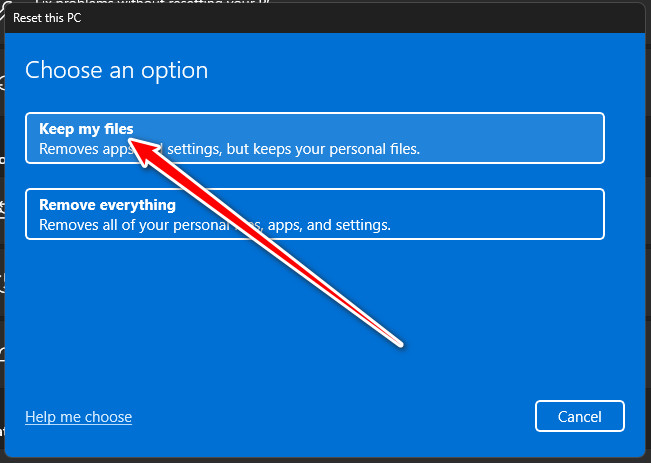 - Select Keep my files to retain your data while reinstalling system files.